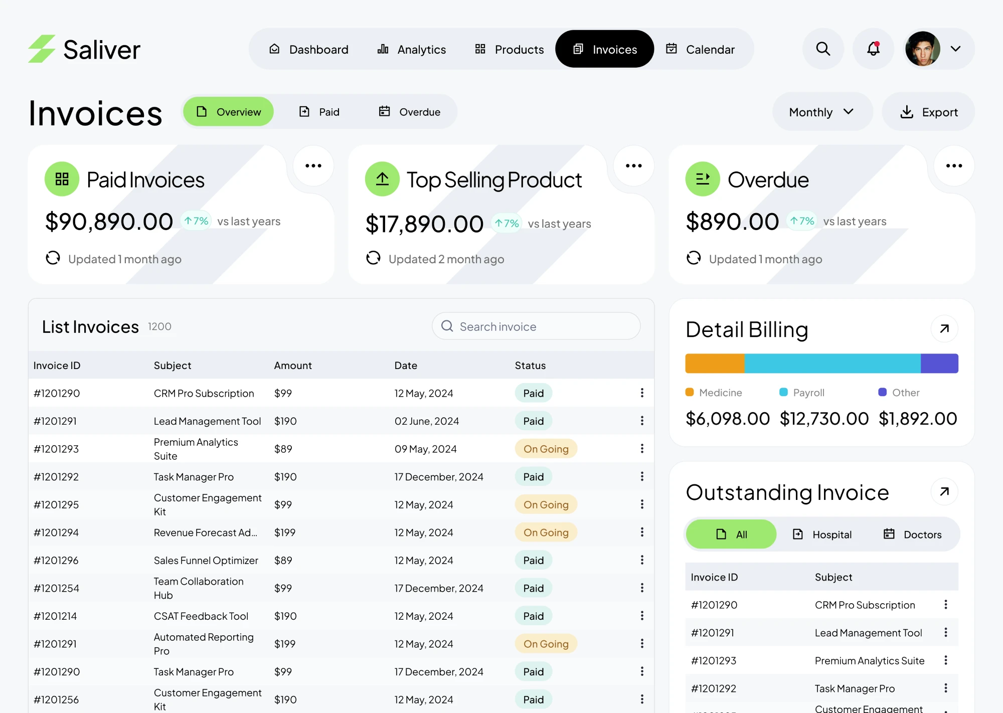 Exportação de relatórios em PDF e Excel, gráficos comparativos por período.