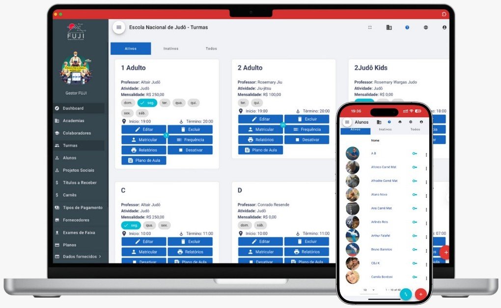 Controle de graduações e faixas, relatórios detalhados sobre a frequência de cada aluno.
